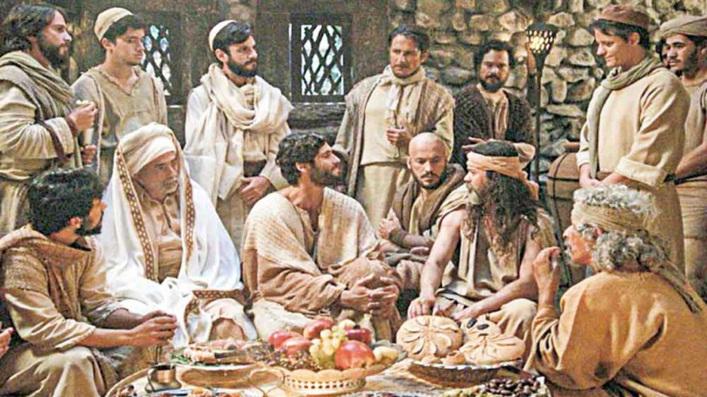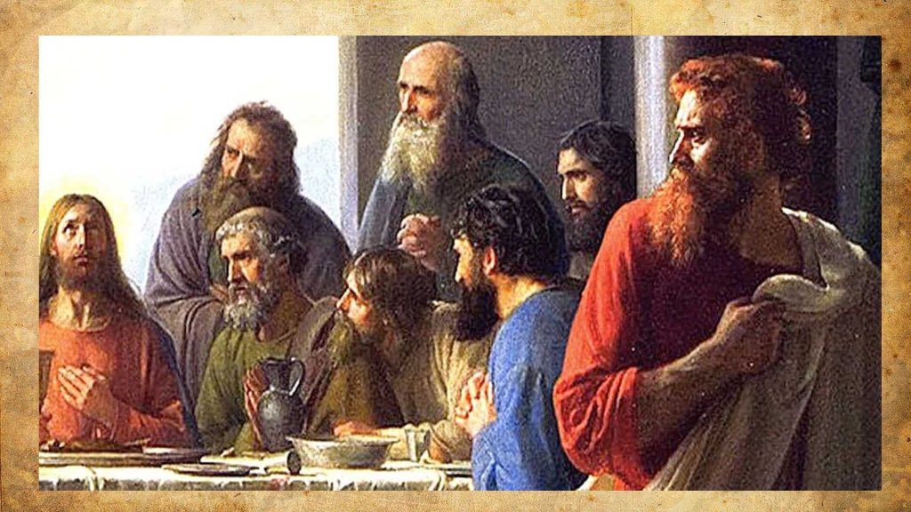 Todo para la cena pascual está listo. Jesús y los doce apóstoles están con él. La mesa es amplia y probablemente había más gente presente, pero sin compartirla. Como en toda fiesta, la hora previa es un pequeño caos, con grupos charlando, gente ordenando cosas y otros cocinando. Los evangelistas no vieron la necesidad de describir el entorno ya que lo dicho por Jesús es lo importante. Aunque el entorno explicaría en cierta medida, lo ocurrido con Judas Iscariote