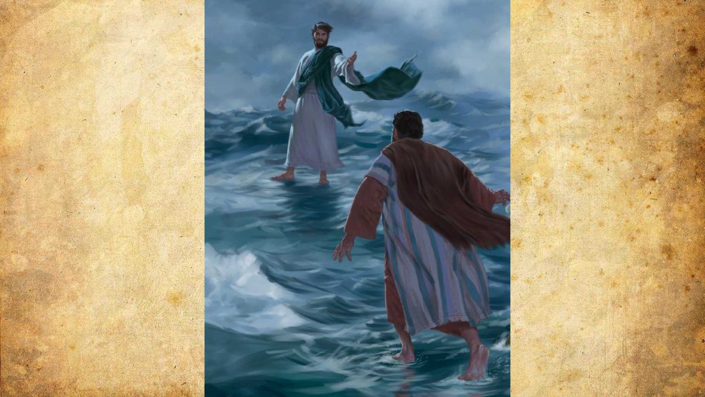 En una oportunidad los apóstoles y Cristo se encontraban en una barca en el mar. Jesús se para, salta la borda y empieza a caminar en el mar. Les dice a sus discípulos que, si tuviesen algo de fe, ellos podrían hacer lo mismo. Pedro en un arranque de vivo entusiasmo, salta por la borda y le sigue. Por un instante camina también sobre el agua, pero lo asalta la duda y se hunde.