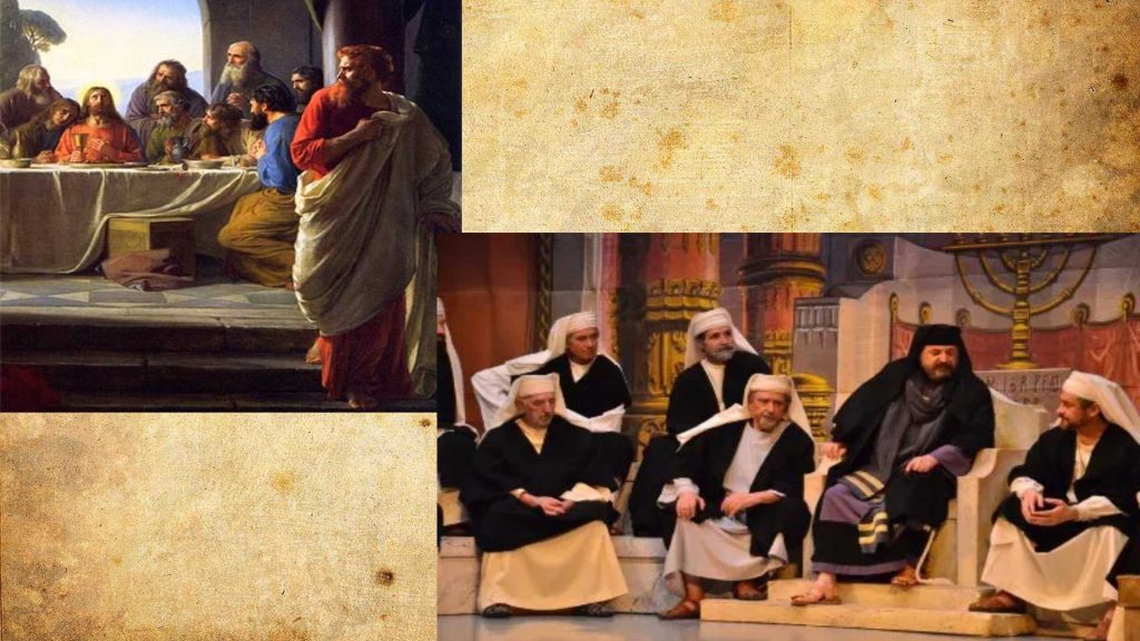 Los evangelios fueron escritos mucho después de lo sucedido esa noche, ¿cómo sabemos que son exactos? Los estudiosos de la biblia afirman que los evangelistas para ese entonces ya habían recibido la bendición del espíritu santo, por lo tanto, lo escrito es inspiración divina. Al parecer Judas esperaba el momento más oportuno para entregar a Cristo, una vez descubierto por el Mesías, sale sin hacer ruido de la reunión pascual. Se dirige al templo a reunirse con el Sanedrín. Este era un consejo que nucleaba a la máxima autoridad religiosa y oficiaba como corte máxima de justicia, con respecto al pueblo judío. Estaba compuesto por un mínimo de 23 jueces y un máximo de 71. Realizaba sus deberes en el templo, solo descansaban los viernes y en las festividades.