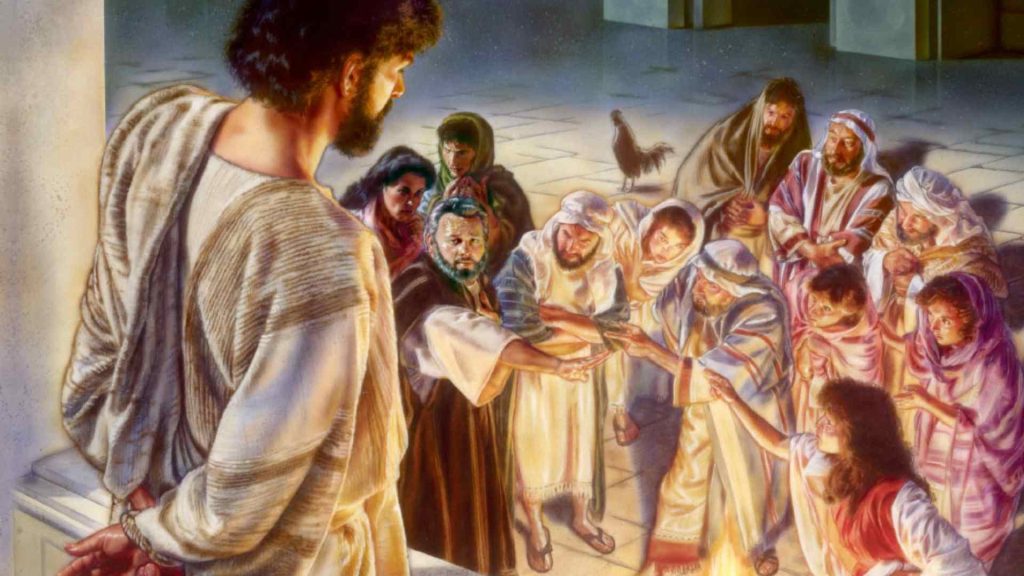 Mientras tanto en el patio, Pedro había visto pasar a Juan, que había entrado a la casa del sumo sacerdote. Cuando es abordado por un hombre que lo reconoce como seguidor de Jesús. Acorralado y rodeado por personas hostiles, niega por segunda vez conocer al reo que esta frente al concejo y trata de escabullirse hacia la salida. Pero una mujer le toma del brazo y lo desmiente a gritos, afirmando que si es uno de los galileos seguidores de Jesús. Lo había delatado su acento.
