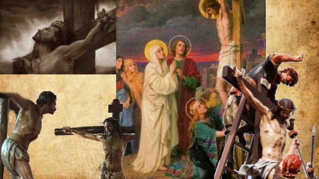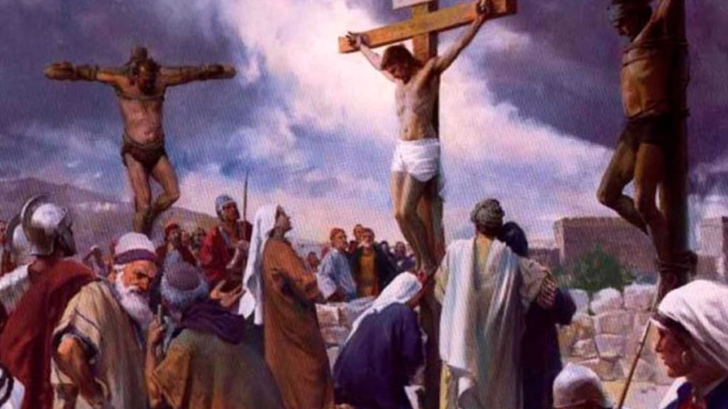 Colocándolo en la cruz se procedió a clavarlo a ella en vez de atarlo, los clavos pasaron su carne sin romperle ningún hueso. Luego se izó la cruz, con un cartel que rezaba “Jesús Nazareno rey de los judíos” esta se deslizo por en un hueco hecho en la tierra, quedando erguida. Jesús en el medio, Dimas el buen ladrón a su derecha y el mal ladrón, Gestas a su izquierda.