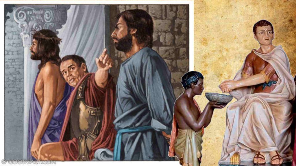 Por aclamación eligen a Barrabas y condenan a Cristo. Poncio Pilatos como muestra que nada tuvo que ver con la decisión, lava sus manos frente a la multitud y da la orden que se proceda a la ejecución, de un inocente.