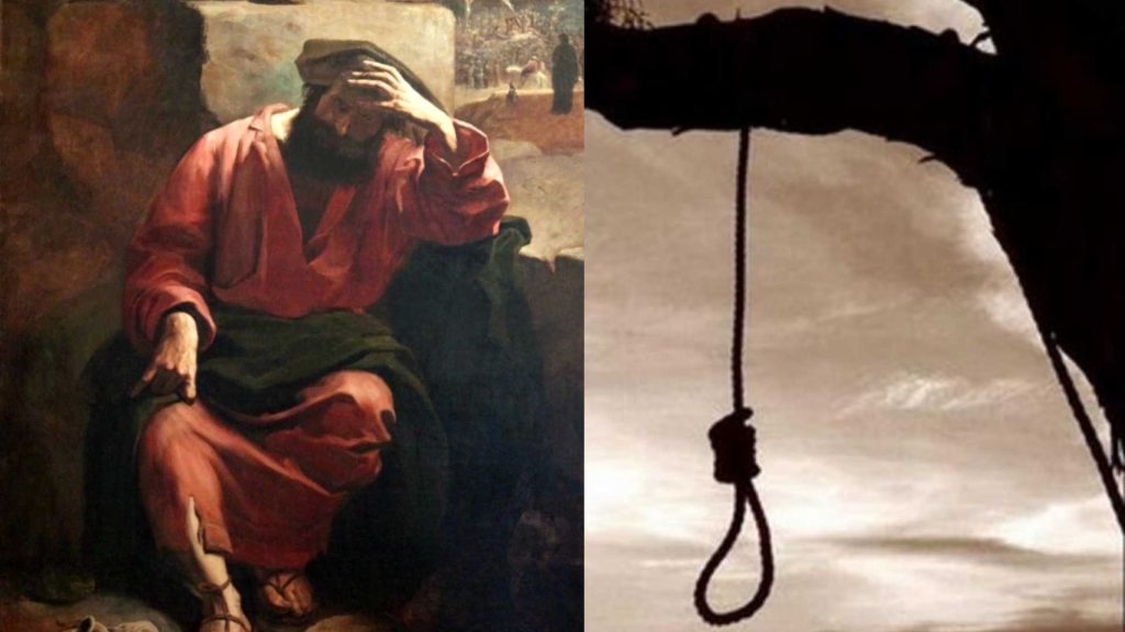 Para este momento Judas se da cuenta que había entregado a Jesús para nada. No hay revelación de su poder, las huestes celestiales no se han manifestado. Y es evidente que Jesús será ejecutado. Desesperado por la culpa, cegado por el error cometido, se aleja de todo y de todos. Incapaz de perdonarse o de encontrar consuelo. Su mente desesperada, atormentada solo ve una salida. Tomando una cuerda, fijo uno le los extremos a una rama de un árbol y el otro en su cuello. Espero unos instantes tal vez oiría las trompetas angélicas, el silencio le recordó su error. Se arrojó al vacío y lo último que escucho, fue el ruido de su cuello al romperse. El sería el primero en morir ese viernes.