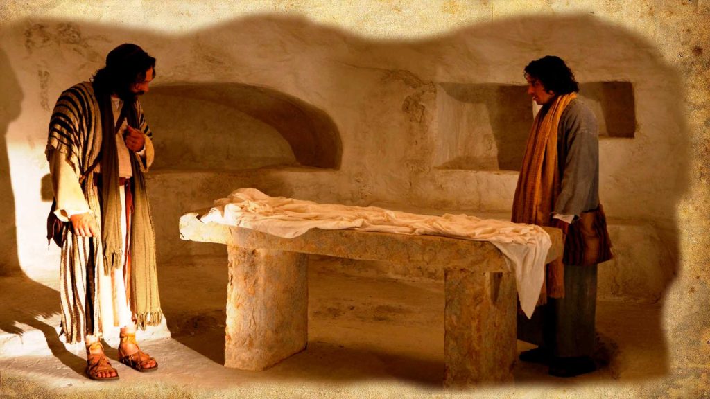 Ve en el suelo, las mortajas con las que el viernes él mismo ayudo a envolver al Maestro. Pedro sin pensarlo dos veces se abalanzó dentro del sepulcro y lo encontró vacío. No dan crédito a sus ojos.