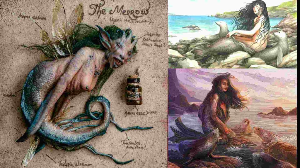 En Irlanda a las sirenas las llaman Merrows. Creen que el número de hembras es superior al de los machos, aunque estos son más feos que sus compañeras. Un merrow masculino poseen dientes puntiagudos y rostro semejante a un cerdo. Todos los merrows poseen membranas en sus manos, gran hostilidad hacia los humanos y unas prendas mágicas, que les permiten atravesar cualquier corriente oceánica. Todo hombre o mujer que le roba la prenda a un merrow tiene poder sobre él.  En muchos relatos, varios hombres esconden estas prendas obligando a las hembras a casarse con ellos. Los hombres ganan así bellas y ricas esposas (debido a los botines que las sirenas obtienen con los naufragios), pero si la esposa merrow recupera su prenda, la llamada del mar será tan fuerte que acabará abandonando a sus hijos y a su marido. En la mitología escocesa, hay una sirena llamada Ceasg o «doncella de las olas». La parte inferior de esta sirena es la de un salmon. Se dice que a aquellos que la capturan les concede tres deseos si la devuelven al agua, pero cuando un hombre se enamora de ella, la mujer-salmón lo seduce y lo arrastra a las profundidades. Famosos son también en Escocia los selkies, hadas marinas que en el mar adoptan la forma de una foca, pero al llegar a la tierra se deshacen de sus pieles para tomar forma de mujer. Al igual que con los merrows, todo hombre que quiera una esposa selkie solo tiene que robarle la piel de foca, pero si ella encuentra la piel, volverá al mar para siempre. Los hijos nacidos de la unión de hombres y selkies tenían membranas que unían los dedos de sus pies o sus manos.