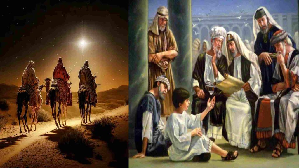 La estrella de Belén que les marca el camino a los Reyes Magos, lo cuales llegan para presenciar el nacimiento de niño. La huida a Egipto a causa de una profecía que indicaba que el verdadero rey de los judíos nacería por esas fechas, algo que no tomo muy bien Herodes. Ya que ordeno a su guardia personal matar a todo recién nacido en la zona de Belén. De nuevo la intervención angélica, evito el asesinato de Jesús, no así la de los santos inocentes. Luego de un tiempo regresan a Judea y es aquí que Jesús se extravía en el templo de Jerusalén, para horror y angustia de su joven madre la cual no podía ingresar al mismo ya que estaba prohibido para las mujeres ciertos lugares del templo. José intervino rápidamente y le encontró discutiendo asuntos teológicos con los rabinos del templo, los cuales maravillados no podían creer la interpretación tan exacta y sin falla de las leyes de Moisés.