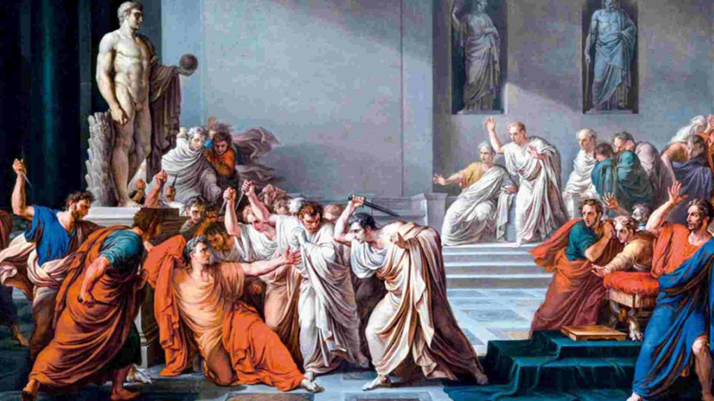 44 a.C.: Al pasar por el teatro de Pompeyo rumbo al senado, Julio Cesar es interceptado por unos 60 senadores que le entregaron para que leyese, un petitorio. Mientras procedía a leerlo, uno de estos senadores saca una daga, hiriendo al general romano y sumo pontífice. Este fue el inicio del ataque de estos senadores, contra al que consideraban un dictador. Y de esta manera salvar a la República. Entre los atacantes se encontraba Cayo Bruto su hijo adoptivo. Al parecer fue el que asesto, la puñalada que finalmente lo mataría. Este asesinato cambio la historia del pueblo romano destruyendo con esta acción la república que pretendían salvar.  El asesinato de Julio César, desencadeno una guerra civil y una serie de eventos que llevaron al fin de la República Romana y al inicio del Imperio Romano.