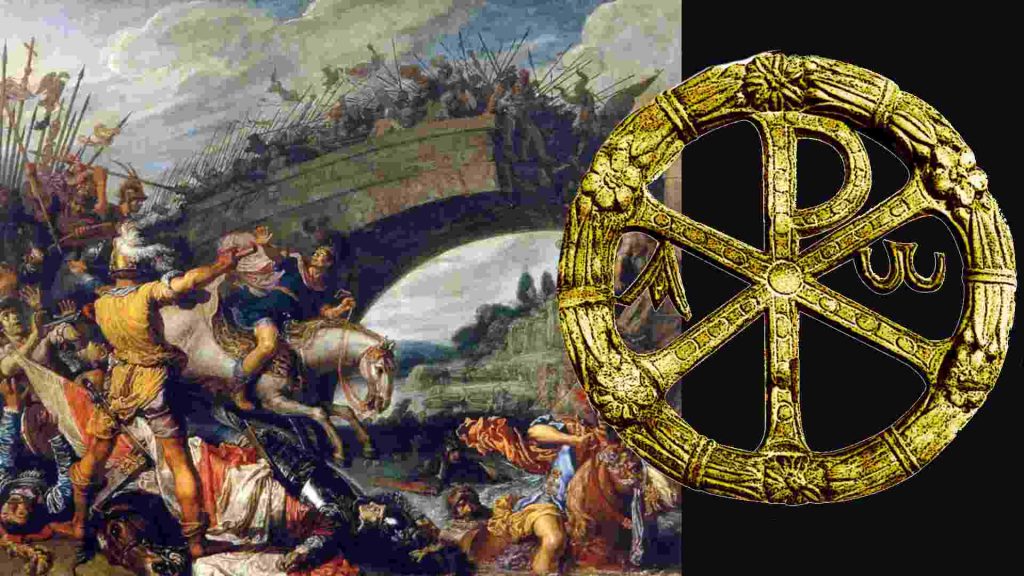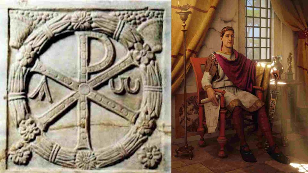 La historia comienza cuando el emperador romano Constantino I (Constantino el Grande) tuvo una visión antes de una importante batalla. Según la leyenda, Constantino vio un símbolo en el cielo que consistía en las letras Chi y Rho juntas, junto con la inscripción griega «Ἐν Τούτῳ Νίκα» (En Touto Nika), que significa «Con este signo, vencerás». Se le dijo que utilizará este símbolo en sus estandartes antes de la batalla de Puente Milvio en el año 312 d.C.