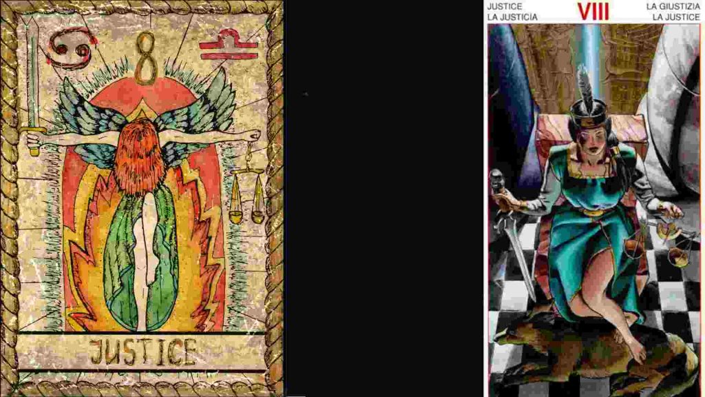 La Justicia, Arcano Mayor número VIII para el Tarot de Marsella y XI en el de Rider Waite, es representada en el Zodiaco por el signo Libra, símbolo de perfección. El principio moral que trata a cada hombre de acuerdo con sus acciones. Hace referencia a la armonía del intelecto y los sentimientos; es la voz de la consciencia que permite establecer criterios internos y externos. Sin embargo, el equilibrio y la perfección no son sinónimos de simetría. Al igual que el arte sagrado de los constructores de catedrales, que rechazaba la simetría como algo diabólico, esta carta también la rechaza.
