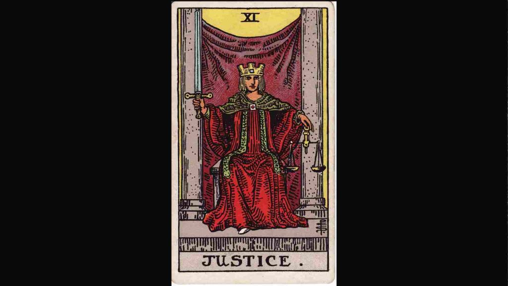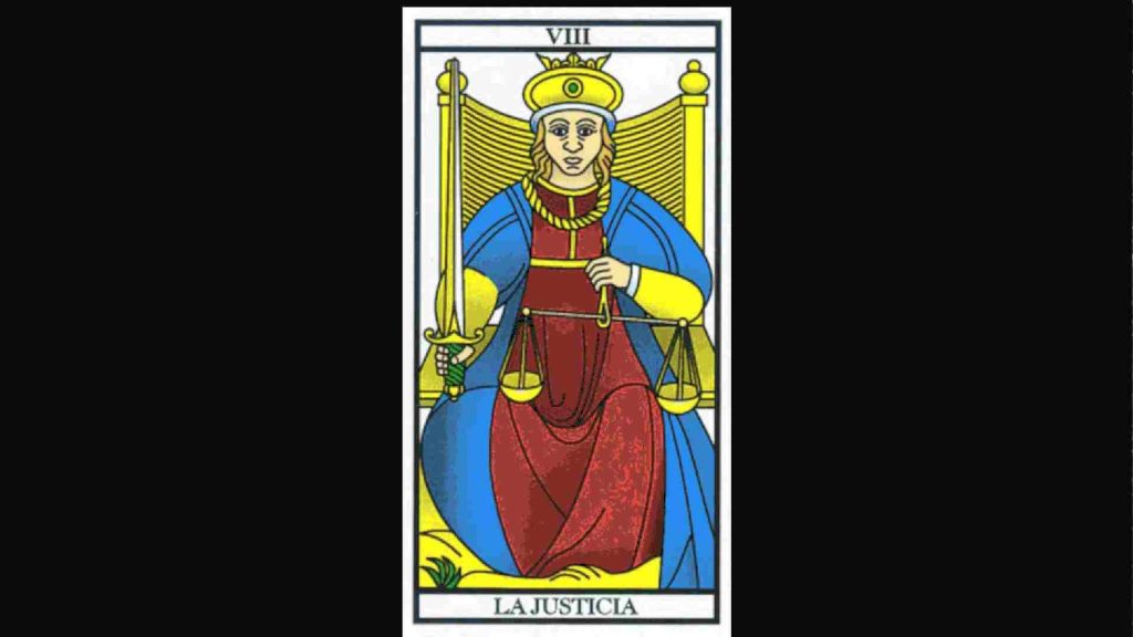 El octavo arcano del Tarot es La Justicia. En la imagen de la carta aparece una mujer de gesto severo, pero que posee imparcialidad en sus decisiones al intentar impartir justicia. La venganza no es parte de su manera de actuar. Ella mira de frente, imperturbable, dedicada por completo a lo que se le ha sido asignado, no hay distracciones. El respaldo del asiento la protege, tal como si se tratara de un escudo, además el gorro o tocado que lleva, que también la separa de todo lo que la rodea. En su mano derecha empuña una espada, como símbolo de que ninguna ley quebrada quedará impune, a través de medidas coactivas. En la mano izquierda sostiene la balanza perfectamente equilibrada, como garantía de justicia.