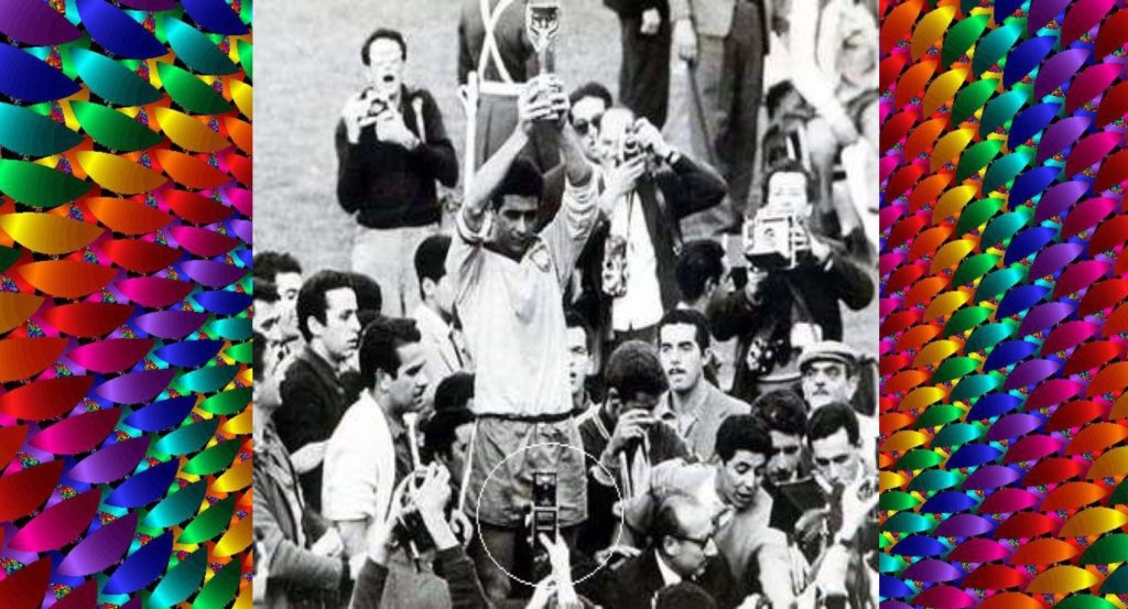 En esta foto se ve al famoso Manuel Francisco dos Santos en mejor jugador del mundial de Chile 1962. Popularmente conocido como Garrincha, levantando la copa del mundo con la camiseta de la selección brasileña. En medio del mar de fotógrafos se ve uno con un celular sacando claramente una foto. Prueba increíble del viaje del tiempo.