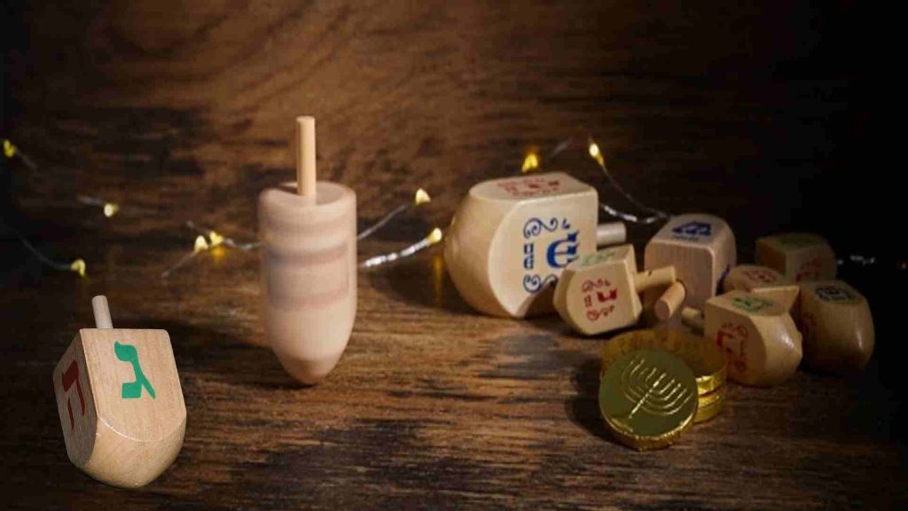 Por ultimo vamos a mencionar al Dreidel. Que no es otra cosa que un trompo o perinola de cuatro lados en los cuales se escriben cuatro letras En muchos hogares judíos se acostumbra a jugar con el dreidel después de encender la janukiá. Cada jugador comienza con unas 10 o 15 monedas (es común utilizar monedas de chocolate), caramelos u otras golosinas. Se coloca una golosina en el “pozo”. Se lo hace girar, se gana o se pierde según la letra que salga, según palabras en idish: Nun–nisht, (nada) no pasa nada, y es el turno del siguiente jugador. Guimel–gants, (todo) el jugador se lleva todo el pozo. He–halb, (mitad) el jugador toma la mitad del pozo, redondeando para arriba si hay un número impar. Shin–shtel ayn, (poner) el jugador pone una golosina en el pozo. El juego continúa hasta que un jugador haya ganado todo.