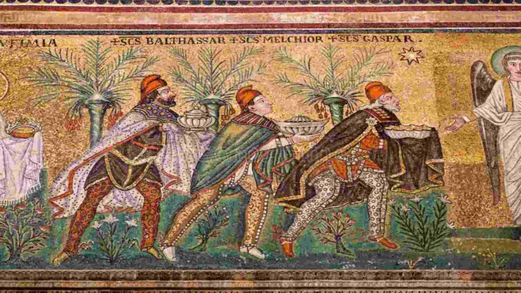 Los nombres de estos reyes magos Melchor, Gaspar y Baltasar aparecen por primera vez en el mosaico de la Iglesia de San Apolinar en Rávena, Italia en el siglo IV. En el mismo, los reyes visten finas túnicas persas y sus nombres están grabados encima de ellos. El título de Mago hace referencia a sabios, no a hechiceros.
