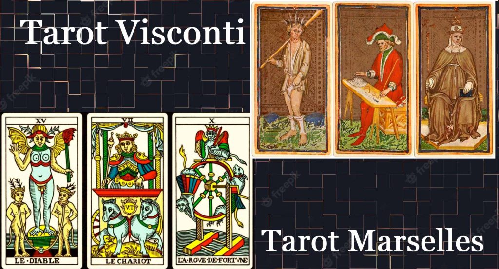 Todos los mazos antiguos que se conservan en la actualidad tienen un mismo origen, Italia. Cuyo epicentro es la ciudad de Milán. Es por este motivo el consenso entre los expertos, que el Tarot como lo conocemos (el tradicional), nace en la península itálica. Como un juego de cortesanos.
