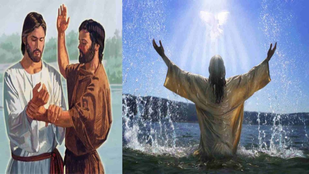 Juan se había ganado el sobrenombre del Bautista por su costumbre de sumergir en el agua del rio Jordán a aquellos que buscaban su concejo y enseñanzas. Según él su bautismo era con agua ya que vendría otro que no merecía atarle las sandalias, que los bautizaría con el fuego del espíritu santo. Cuando finalmente llega Jesús a bautizarse, Juan en un principio se niega. ¿Cómo era posible que siervo fuese mayor a su amo? El Nazareno le dice que así debe de ser hecho, Juan obedece en silencio y lo bautiza. Al emerger del agua, aparece sobre Jesús una paloma y se oye la voz del Altísimo diciendo que ese es su hijo bien amado. Luego de este evento comienza la predica de Jesús el cual ira al desierto y ayunara cuarenta días.