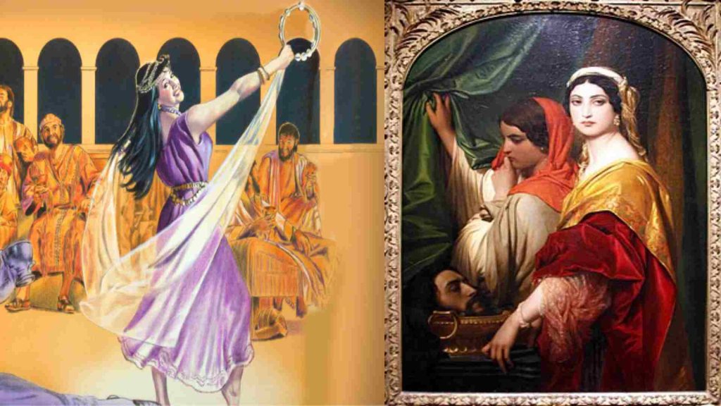 Era el cumpleaños de Herodes y toda la corte se congrego, viniendo gente muy poderosa incluso de Roma, a sus festejos. La fiesta era esplendida y la música inundaba el palacio llegando incluso a las mazmorras donde se encontraba el Bautista. En medio de la fiesta aparece una bailarina cubierta con un velo. Al son de las flautas y tambores despliega una hermosa y complicada danza que deja a todo el mundo impresionado al terminar Herodes pide que se descubra. Grande fue la sorpresa al ver que la bailarina no era otra que la princesa Salome, hijastra y sobrina de Herodes.
