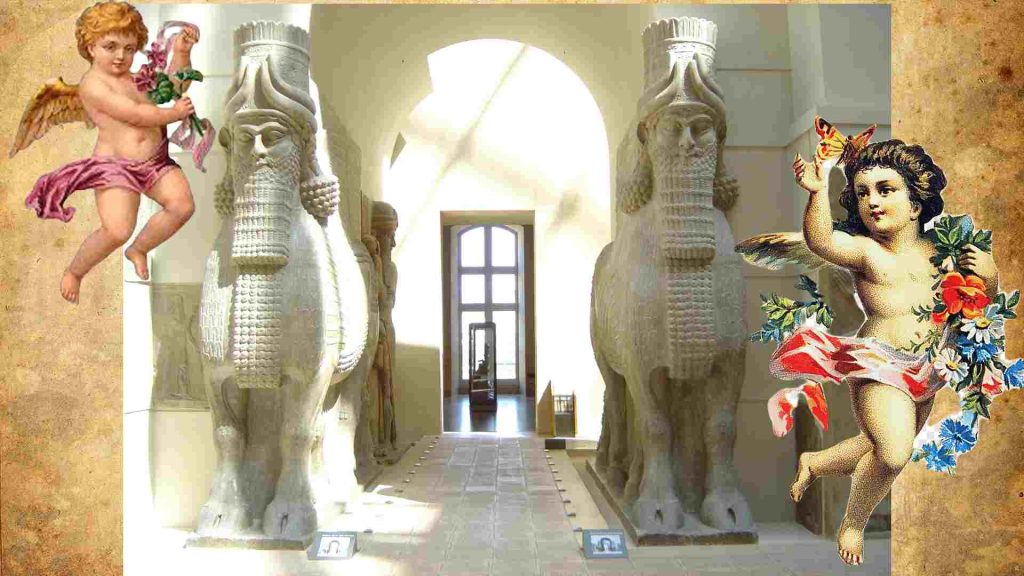 En la tradición cristiana occidental, los querubines se han asociado popularmente con los Putti (los “amorcillos” que acompañaban al dios Cupido/ Eros, y a la diosa Venus/Afrodita de la mitología grecorromana) lo que resulta en representaciones de querubines, como niños pequeños, regordetes y alados, sin embargo, estos son seres de carácter secular, no bíblicos. Históricamente los persas también incorporaron kerubes guardianes, como se pueden ver hoy día en las ruinas de Persépolis. Tenían algunas figuras de con cuerpo de hombre, cabeza de león y cuatro alas. El término pasa a designar en parte de las escrituras cristianas a un tipo de “ángel” o “mensajero divino”. Durante el cautiverio en Babilonia, este término pasó a la Biblia hebraica, y posteriormente al Nuevo Testamento que le dio la forma definitiva. La palabra se encuentra testimoniada en tres idiomas antiguos en acadio, en asirio y en babilónico. Para estas culturas el querubín era un genio alado, guardián sagrado de las puertas, en forma de algún animal, especialmente bajo el aspecto de un toro alado con cabeza humana.