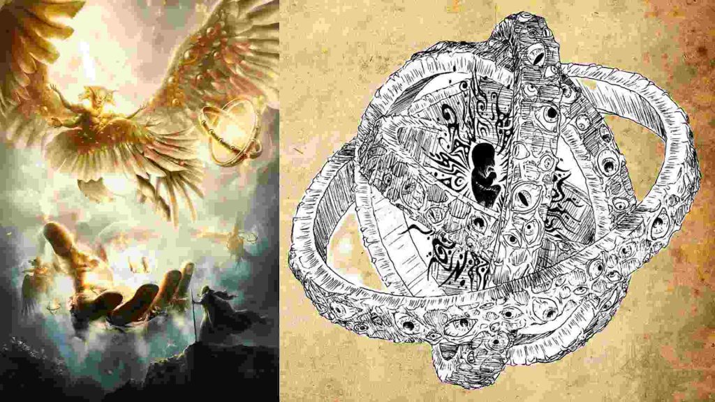 Estas entidades fueron creadas en el vacío primigenio, antes de la creación y fueron testigos del proceso de la misma. Contemplaron la primera luz, la separación de las aguas de la tierra. Vieron a Dios crear el paraíso, los animales y luego a Adán y Eva. Los padres de la Iglesia los consideraban por esas características, superiores a la humanidad. Sin embargo, aquí surge un punto áspero y es que al parecer Dios puso a la humanidad por encima de los Ángeles, al dotar a esta de libre albedrío. Esta sería la causa de una, de las dos rebeliones angélicas. La negativa de parte del Querubín Luzbel, (Luz de la Mañana) de servir a la humanidad por mandato divino. Esta negativa genero un cisma y trajo como consecuencia la caída de un tercio de las tres jerarquías angélicas. Esos ángeles fueron degradados a demonios, generando su propia jerarquía y siendo exiliados al averno. Luzbel se convertiría en Lucifer, príncipe del infierno.
