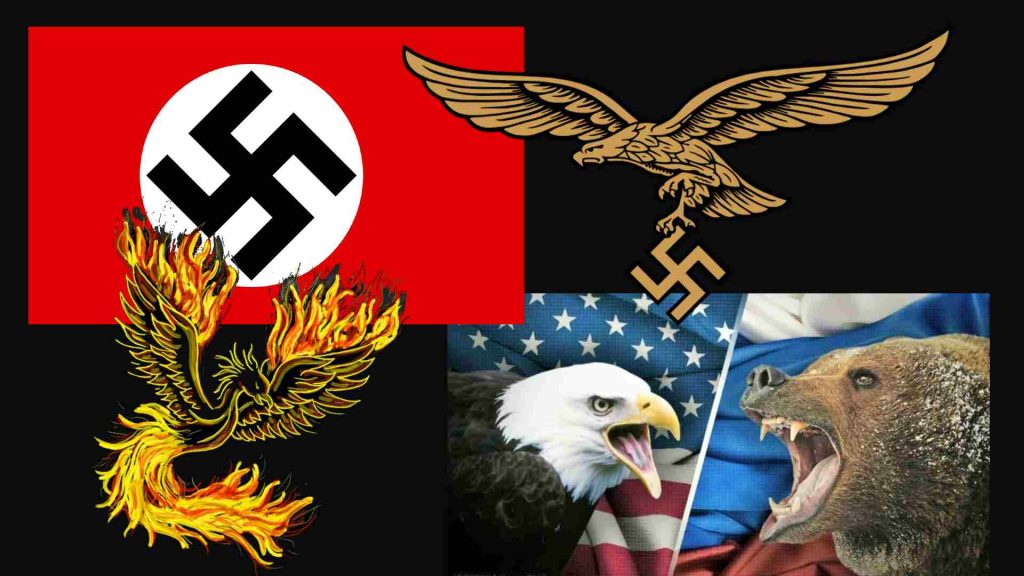 Hay algunas escuelas de ocultismo que dicen que los nazis pervirtieron el mensaje original de un signo muy antiguo y poderoso, por eso fueron imparables durante el comienzo de la guerra. La lucha en el plano simbólico es muy interesante de estudiar. El águila alemana aliada en lobo italiano y el fénix japonés. Le declararon la guerra al gallo francés y al león inglés. Al principio de las hostilidades, el oso ruso apoyó a los alemanes. El águila venció sin muchos inconvenientes al gallo y replegó al león a su isla.
