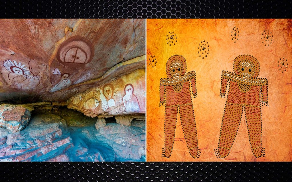 Hace 74.000 años los aborígenes australianos que eran recolectores y cazadores nómades pintaron a los Wandjina, responsables de las lluvias, los relámpagos, los creadores de la vida en la tierra. Sus pinturas fueron protegidas por las inclemencias del tiempo gracias a la combinación de refugio y la aridez del entorno. Plasmados en colores llamativamente vivos y con una técnica depurada. Representaron estos ancestrales artistas a unos seres antropomorfos con cuerpos rígidos y cabezas grandes como si portasen alguna especie de casco y cuya ropa parecería tener dos colores.