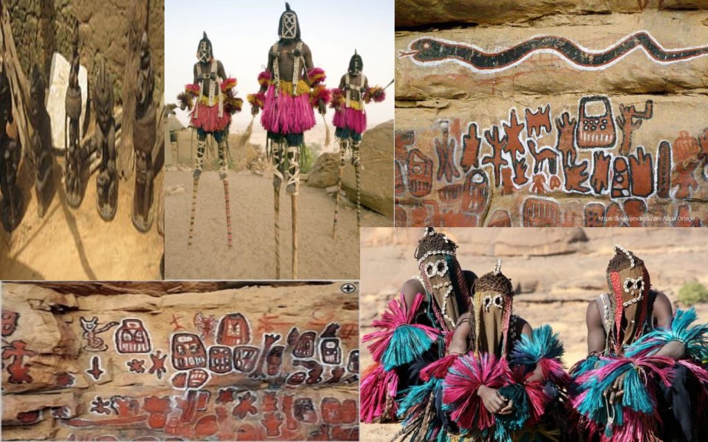 Sus ritos, el uso de las elaboradas máscaras y de zancos para parecer más altos tiene relación con su mito de la creación. Donde los portadores de la luz , trajeron al pueblo dogon de un lugar muy lejano a esta tierra extraña, como sus servidores. Las máscaras representan el rostro o lo que llevaban encima del rostro esos portadores de la luz. Como eran muy altos, la solución que encontraron fueron usar zancos para que cuando volviesen les reconocieran, ya que por motivos ignotos los portadores de la luz se fueron sin llevarse a los dogon, de regreso con ellos, abandonándolos en esta tierra