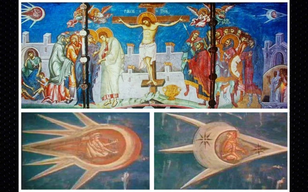 Hay innumerables testimonios que han quedado registrados en todas las culturas, de eventos extraños. Hay algunas obras de arte antiguo que tiene elementos algo discordantes con la época en que fueron creados y uno de esos casos es la Crucifixión de 1350, esta obra se encuentra en el monasterio de Voki Decani en Kosovo. En el fresco se puede apreciar la escena central de la crucifixión de cristo al estilo de la época y con claras influencia bizantina en la pintura, lo que llama la atención son las dos figuras en los extremos superiores que recuerdan a sendos objetos tripulados. Incluso uno posee ventanas y recuerda un muy pequeño jet. Esto es obra de la imaginación del artista medieval que lo pinto o solo plasmo algo que vio en los cielos transilvanos hace seiscientos años. Lo cual planteas muchas preguntas.