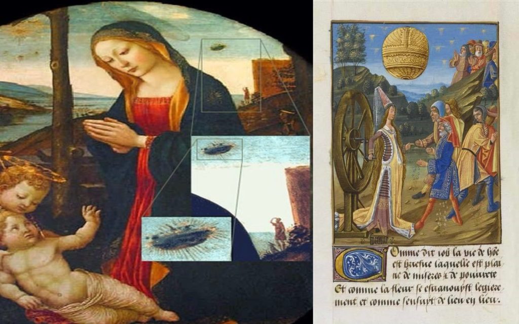 Hay un texto de 1338 -que se encuentra en el Museo Conde de Chantilly, Francia- muestra una gran esfera flotando en el cielo, lo que para algunos puede ser una representación astronómica, una nave o, sencillamente, un orbe. Esta ilustración es anterior al de la Madonna de Mainardi lo que inmediatamente uno se da cuenta, es lo conspicuo de la esfera, lo que parece ser algo de la imaginación del artista ya que semejante objeto no pasaría inadvertido para las crónicas de la época.