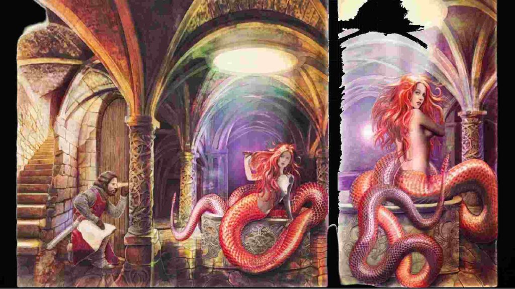 El que una mujer rica, hermosa y a todas luces noble, se le declarase poniendo a su disposición su fortuna era algo totalmente único e irrepetible. Pero como verán, no todo resulta tan fácil como uno pensaría. El hada cumplió con su parte, del matrimonio nacieron diez hijos. Durante el primer año de casados, Melusina emprendió la construcción de varios castillos y fortalezas, contribuyendo a la pujanza y el esplendor de la familia Lusignan a la que pertenecía su esposo. Sin embargo, su marido incumplió la promesa nupcial. Un sábado, empujado por la curiosidad incitada en parte por su hermano, Raimondino abrió con su espada un agujero en la puerta tras la que se bañaba Melusina. La vio muy blanca, muy bella, pero también observó cómo salía de la tina, su cola de serpiente.