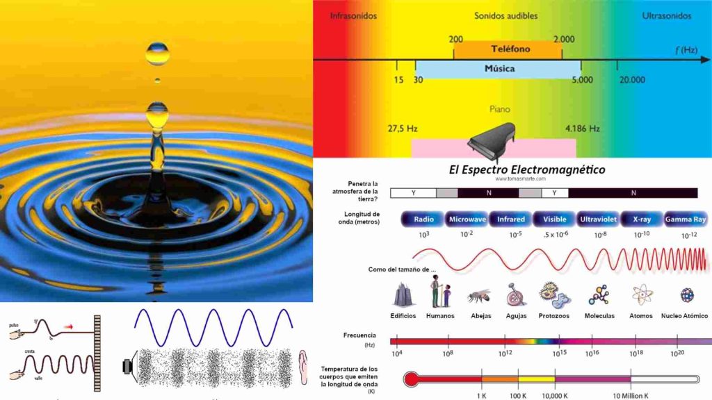 Imaginen un estanque con agua, si tiro una piedra esta provoca olas en su superficie, que se alejan del lugar del impacto de forma concéntrica, eso son ondas. Si ato el extremo de una cuerda y tomo el otro y lo agito provoco ondas en el cuerpo de la cuerda. La cual poseen una altura (amplitud) y una distancia entre picos (frecuencia), Una característica de las ondas es que estas se propagan por un medio. Agua, aire , roca y el propio espacio. Las ondas se pueden propagar en un plano, como el de la cuerda. En dos dimensiones como las ondas sonoras las que se propagan por el aire y son escuchadas por nuestros oídos. Y en tres ejes como las ondas electromagnéticas. Que constituyen la luz que perciben nuestros ojos.