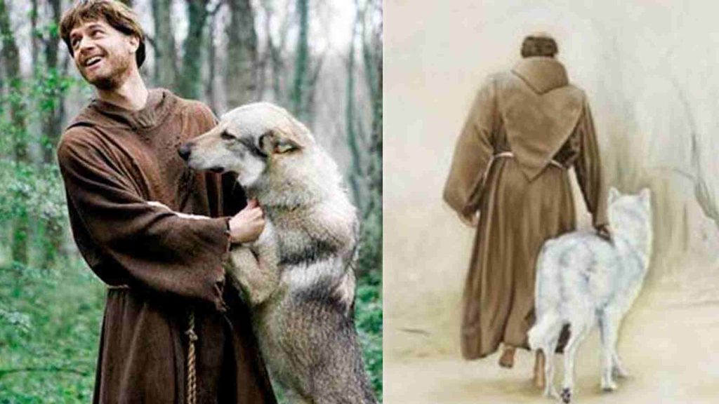 El lobo de Gubbio era un cánido feroz, que asolaba la ciudad homónima, situada en Umbria. De acuerdo con la narración, este lobo había devorado tanto animales como personas. Presentaba tal ferocidad que nadie se aventuraba siquiera a salir de la ciudad. San Francisco, movido por su compasión a los habitantes del lugar, actuó motu proprio sin que solicitaran su intervención. Buscó al lobo y lo conminó en nombre de Cristo. Logró hacer un pacto con él al “convencerlo” de no seguir sus fechorías a cambio que los pobladores le darían el sustento que necesitaba. La bestia puso una pata delantera sobre la mano de Francisco en señal de asentimiento. Apenas el pobrecito de Asís trazó la señal de la cruz, el lobo cerró la boca y se echó a sus pies. Conducido por Francisco hasta la ciudad, el lobo vivió en ella durante dos años hasta su muerte por vejez.