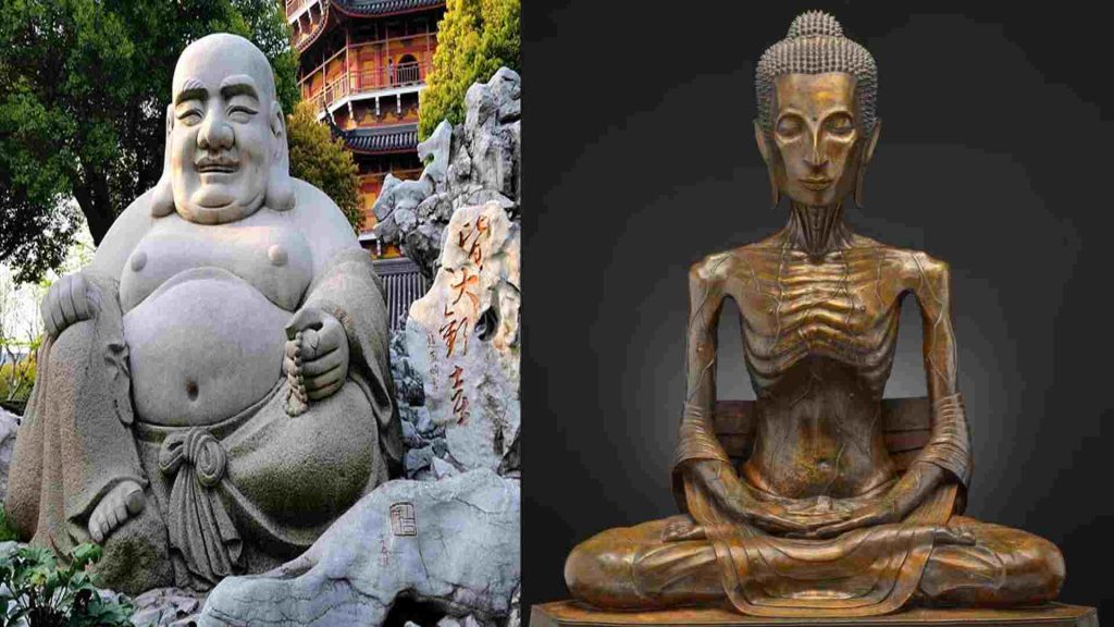 El príncipe Gautama abandona su hogar de privilegio y cuidados a darse cuenta que el mundo que le han enseñado no es el real. Aprende de dos maestros, diferentes clase de yogas y de meditación, sin embargo, no estaba satisfecho. Había recorrido el camino del hedonismo (el placer como meta) al ascetismo extremo (mortificación de cuerpo). Es por este motivo que hay estatuas de Buda en la cual se representa como un hombre obeso sonriente y en otras en hombre extremadamente delgado, casi un esqueleto. Estas son diferentes etapas del maestro, se cuenta que, en su etapa más extrema de mortificación, extenuado por el hambre, una muchacha campesina le brinda un tazón de arroz con miel, en la creencia que se trataba de un espíritu, por la extrema delgadez de su cuerpo. Gautama acepta esta caridad.