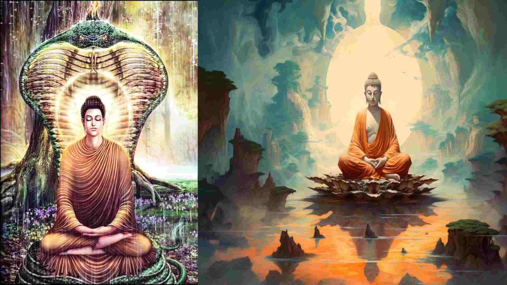 Pues ahí se quedó meditando, pasaron los días y luego semanas. En uno de esos días se generó una importante tormenta, Buda imperturbable seguía en su meditación. Viendo esto, Mucalinda el rey de los nagas (los nagas son semidioses inferiores con forma de serpiente) decide proteger al maestro meditante. Tomando la forma de una colosal cobra real, Mucalinda se enrosco en el cuerpo de Buda y extiendo su capuchón, lo protegió de la lluvia y el frio.